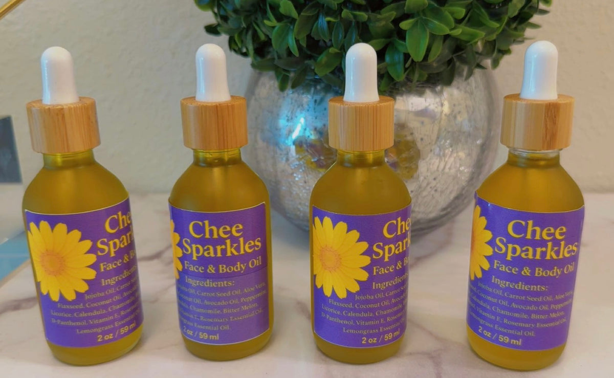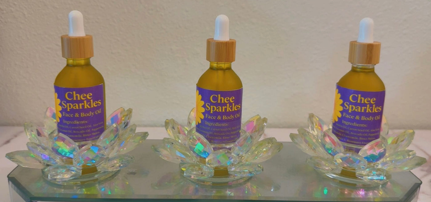 Chee Sparkles Face & Body Oil. A nourishing blend of natural oils and botanicals that soften, hydrate, and restore your skin’s...